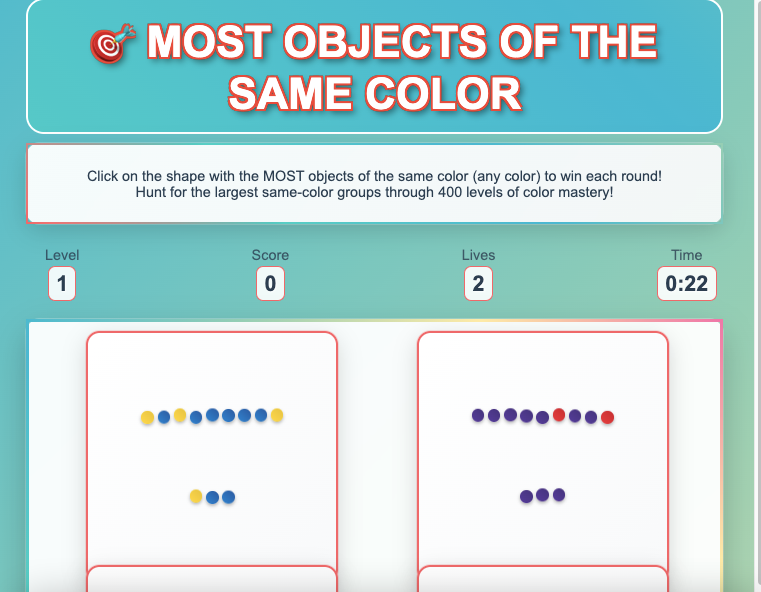 Simple to learn, impossible to master! Each level presents multiple colorful shapes filled with vibrant objects in various colors. Your mission? Spot and click the shape containing the LARGEST GROUP of objects in the SAME COLOR (any single color)!